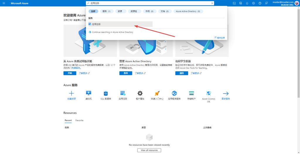 然后,我们打开Azure的控制面板,然后再搜索框搜索“应用注册”