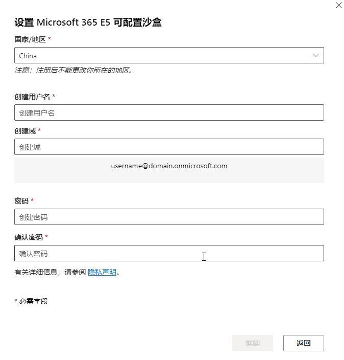 然后它会让你选择一种方案:即时沙盒和可配置沙盒,没有很大的区别,只是邮箱域名能自己配置和不能的区别。可配置沙盒可以让你选择”.onmicrosoft.com”前面的内容,其实就相当于邮箱自定义二级域名。